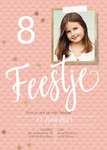 Wauw wat een leuke uitnodiging van Luckz! De uitnodiging heeft gouden stippen en een roze achtergrond. Pas de tekst aan en voeg een foto van jezelf toe.