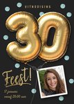 Nodig iedereen uit voor je 30ste verjaardagsfeest met deze leuke persoonlijke kaart van Luckz! Op de kaart staat het getal '30' in het goud op een donkere achtergrond. De foto en de tekst op de kaart kan worden aangepast!