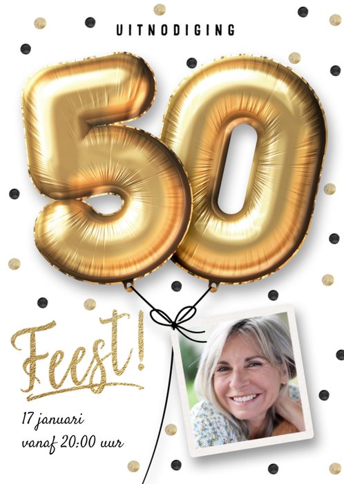 Nodig iedereen uit voor je 50ste verjaardagsfeest met deze leuke persoonlijke kaart van Luckz! Op de kaart staat het getal '50' in het goud op een witte achtergrond. De foto en de tekst op de kaart kan worden aangepast!