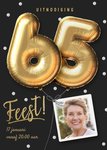 Nodig iedereen uit voor je 65ste verjaardagsfeest met deze leuke persoonlijke kaart van Luckz! Op de kaart staat het getal '65' in het goud op een donkere achtergrond. De foto en de tekst op de kaart kan worden aangepast!