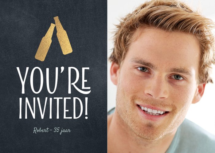 Iets te vieren? Nodig iedereen uit met deze vrolijke verjaardagsfeest uitnodiging. De biertjes proosten alvast en je uitnodiging is extra persoonlijk met jouw eigen foto.