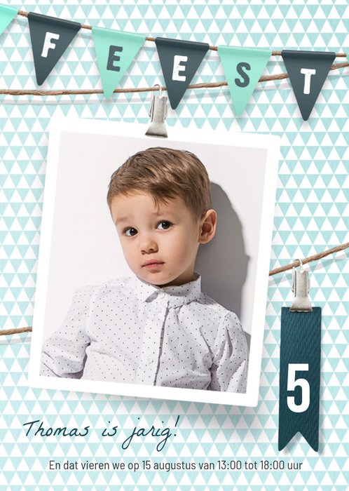 Wauw wat een leuke uitnodiging van Luckz! De uitnodiging heeft een blauw wit patroon. Pas de tekst aan en voeg een foto van jezelf toe.