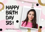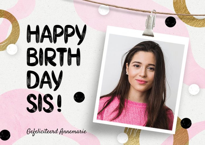 Hiep Hiep Hoera! Jij kent iemand die jarig is. Stuur daarom deze feestelijke verjaardagskaart van Luckz. Op de verjaardagskaart staat: Happy birthday sis! Gefeliciteerd [naam]. Je kunt een foto toevoegen.