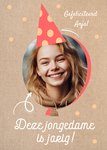 Vrolijke felicitatiekaart met foto in een ballon. Plaats de jarige onder het feesthoedje en verras haar met deze leuke kaart.