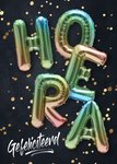 Feestelijk felicitatiekaartje voor een varjaardag van een man met kleurrijke folie letter ballonnen.