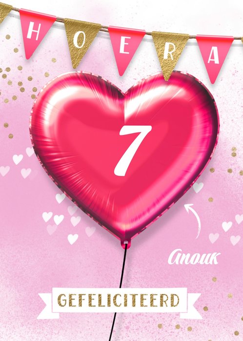 Feliciteer de jarige met deze feestelijke kaart. Bovenaan hangt een slinger met de tekst "HOERA". In het midden van de kaart is een ballon afgebeeld. De naam en leeftijd kan je aanpassen.