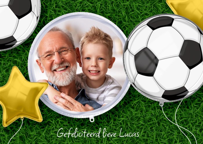 Felicitatiekaartje voor een verjaardag van kleinzoon met voetballen en sterren. Pas de foto en tekst aan en maak zo je originele verjaardagskaartje voor een jongen.