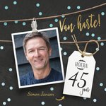 Feliciteer een jarige met deze feestelijke verjaardagskaart. Op de kaart staat de tekst: Van harte! Hoera 45 jaar. De naam op de kaart is aanpasbaar en je kunt een leuke foto toevoegen.