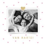 Feliciteer de jarige met dit schattige verjaardagskaartje met roze hartjes. Voeg een leuke foto toe om de kaart extra persoonlijk te maken. "Van harte!"