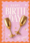 Vrolijke felicitatiekaart voor een verjaardag van een vrouw. Met hippe ballonnen in de vorm van champagne glazen op een frisse achtergrond in roze en oranje. Wat zijn ze hip hè, de kaartjes van Luckz! Originele, persoonlijke kaarten voor ieder moment, die je eenvoudig kan aanpassen. Kenmerkend met een frisse, unieke stijl: trendy, stijlvol en stoer.