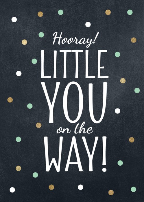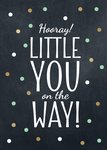 Verras iemand met een leuke kaart voor haar zwnagerschap met een kaart van Luckz. Op deze kaart staat de tekst: Hooray! Little you on the way! Daaromheen staan allemaal gekleurde stipjes.