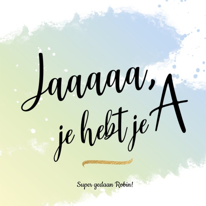 Wat goed! Jij kent iemand die geslaagd is. Stuur een leuk geslaagdkaartje van Luckz! Op deze kaart staat: Jaaaaa, je hebt je A. Super gedaan [naam].