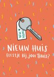 Leuke nieuwe woning kaart met illustratie van een sleutel en de tekst: Nieuw huis feestje bij jou thuis?