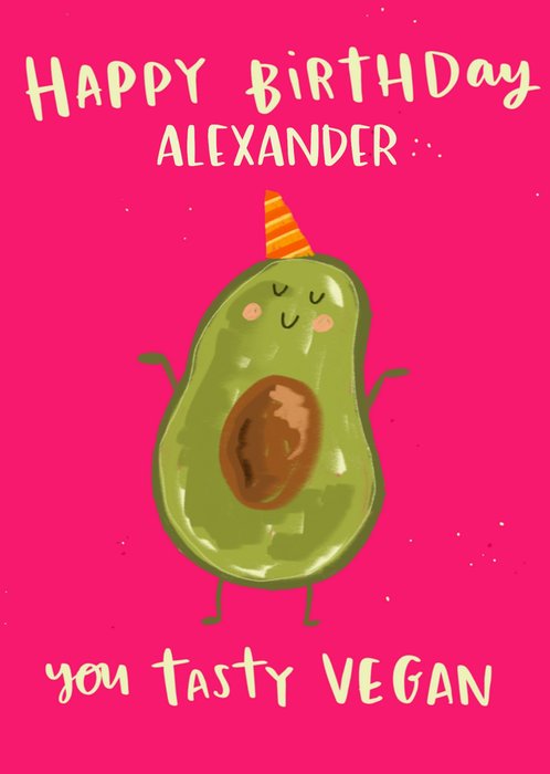 Leuke verjaardagskaart met avocado illustratie en aanpasbare naam.