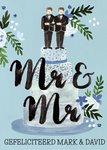 Vrolijke huwelijkskaart met illustratie en aanpasbare naam.