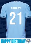 Leuke verjaardagskaart met een voetbal shirt, aanpasbare naam en leeftijd en de tekst: 'Happy Birthday'. Verras de jarige voetbalfan met deze fotografische en kleurrijke verjaardagskaart van Manchester City F.C.