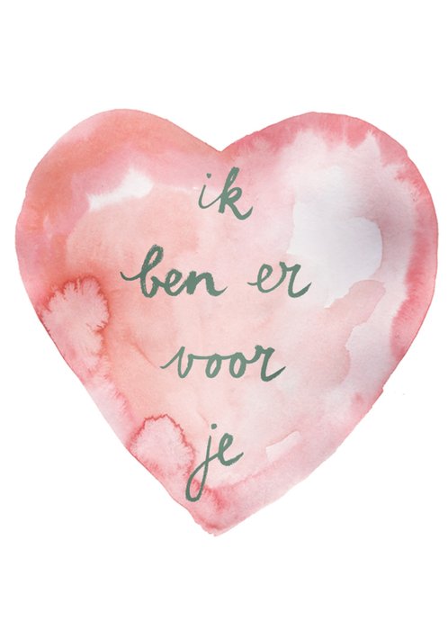 Stuur je steun op met deze lieve condoleancekaart. Op de kaart staat een prachtig roze hart van aquarel, met de tekst (in het olijfgroen): Ik ben er voor je.