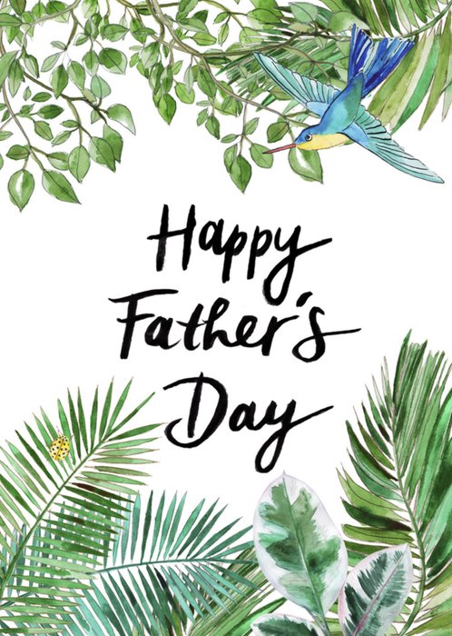 Wens jouw vader een fijne vaderdag met deze vrolijke kaart van Marie Bodié. Aan de boven- en onderkant van de kaart zijn illustraties van bladeren te zien. Midden op de kaart staat de tekst: Happy Father's Day.