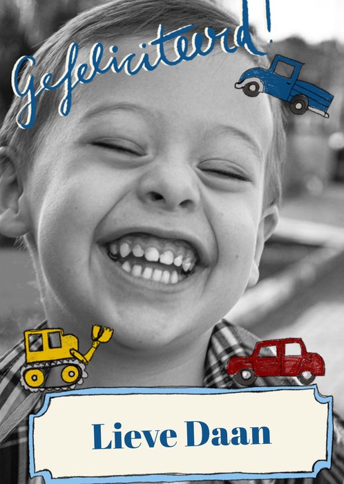 Kleurrijke verjaardagskaart met illustraties van autos, aanpasbare foto en de tekst: 'Gefeliciteerd'. Verras de jarige met deze illustratieve verjaardagskaart van Marie Bodie.