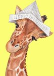 Kleurrijke verjaardagskaart met illustratie van een giraffe met een kranten hoedje, gele achtergrond en de tekst: 'Happy birthday'. Verras de jarige met deze illustratieve verjaardagskaart van Marie Bodie.