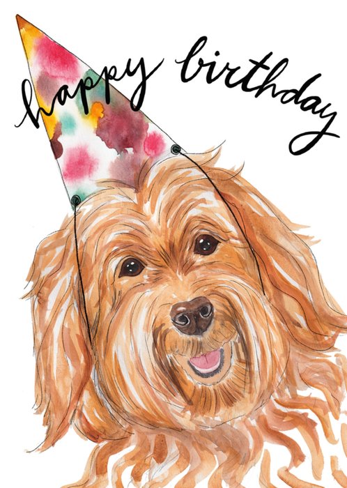 Kleurrijke verjaardagskaart met illustratie van een feestelijke hondje en de tekst: 'Happy birthday'. Verras de jarige met deze illustratieve verjaardagskaart van Marie Bodie.
