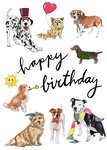 Kleurrijke verjaardagskaart met illustraties van hondjes en de tekst: 'Happy birthday'. Verras de jarige met deze illustratieve verjaardagskaart van Marie Bodie.