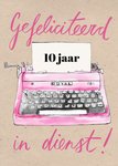 Kleurrijke werk jubileum kaart met illustraties van een typemachine en de tekst: 'Gefeliciteerd __ jaar in dienst!'. Verras je collega met deze illustratieve werk jubileum kaart van Marie Bodie.
