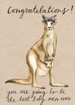 Kleurrijke zwangerschapskaart met illustraties van kangaroos en de tekst: 'Congratulations! You are going to be the best baby oven ever'. Verras mommy to be met deze illustratieve zwangerschapskaart van Marie Bodie.