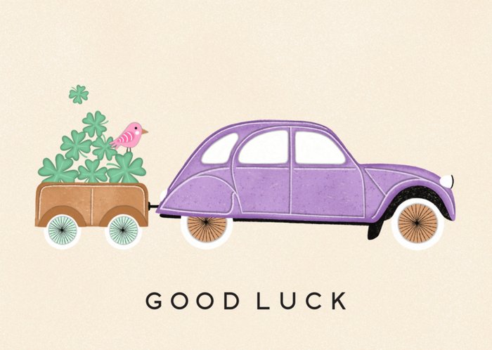 Wens iemand succes met deze leuke succeskaart van Marieke Witke. Op de kaart staat de illustratie van een auto met een aanhanger klavertjes vier.