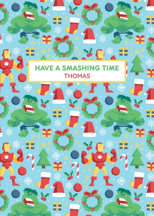 Leuke kerstkaart van Marvel met Hulk, Iron man en feestelijke illustraties.