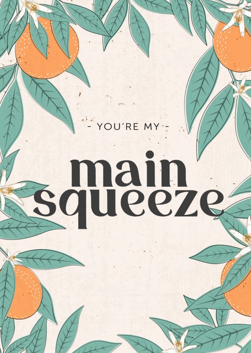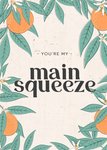 Mooie kaart met daarop de tekst 'You're my main squeeze' en meerdere sinaasappelen op de kaart.