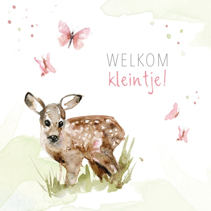 Een baby geboren? Stuur dan deze liever kaart met hertje. Op de kaart staat: Welkom kleintje!