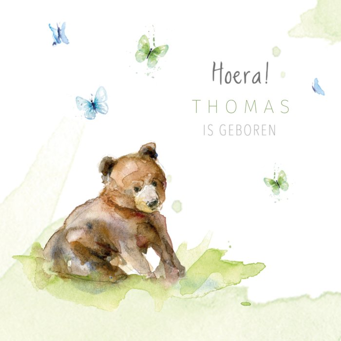 Feliciteer de kersverse ouders met de geboorte van hun zoon. Op de kaart zie je een schattige beer, omringt door vlindertjes. De naam is aanpasbaar.