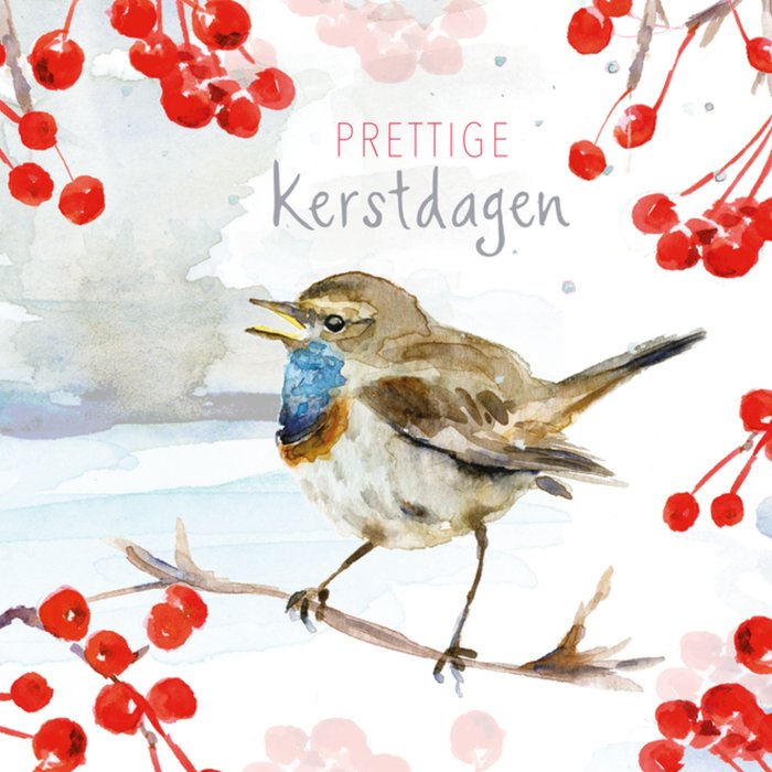 Verras met deze vrolijke kerstkaart met een aquarel illustratie van een vogel en bessen. De kaart is niet aanpasbaar.