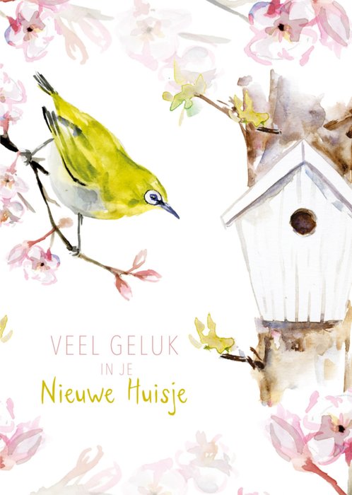 Prachtige nieuwe woning kaart met een vogel, bloemen en de tekst: 'Veel geluk in je nieuwe huisje'. Verras iemand met deze kleurrijke aquarelkaart van Michelle Dujardin.