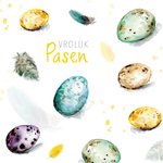 Wens een vrolijk Pasen met deze vrolijke kaart met paaseieren en veertjes. Daarbij staat de tekst: "Vrolijk Pasen."