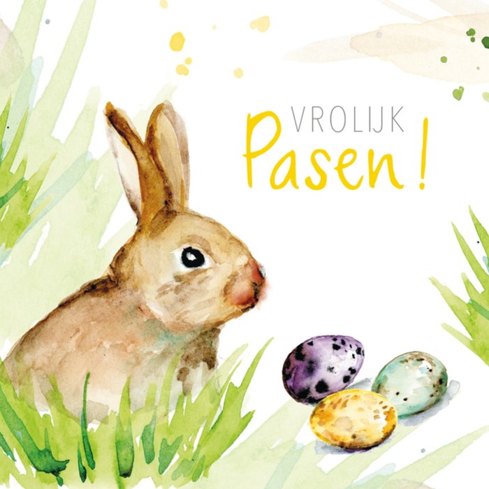 Kleurrijke kaart om iemand een fijne Pasen mee te wensen. Op de kaart zie je een konijn en paaseieren. Ook staat er op de kaart de tekst: Vrolijk Pasen!