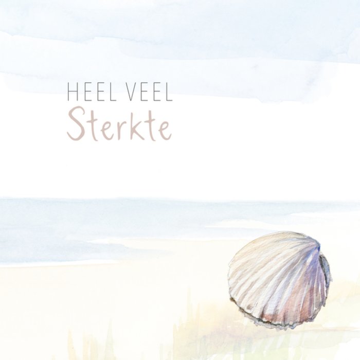 Wens iemand sterkte in een moeilijke tijd met deze mooie aquarelkaart. Een strand en een schelp met daarbij de tekst "Heel veel sterkte".