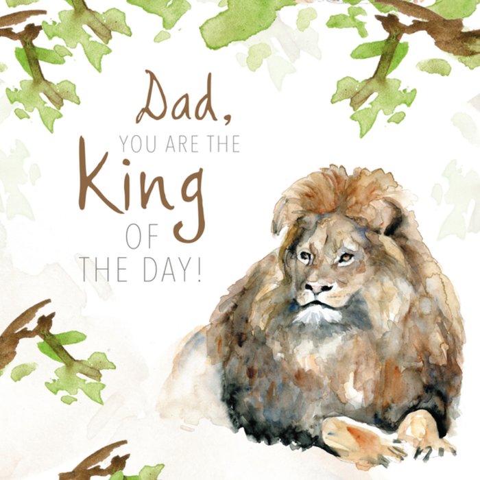 Stuur deze stoere vaderdagkaart met leeuw aan je vader. Op de kaart staat: Dad, you are the king of the day.