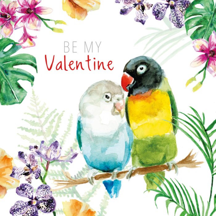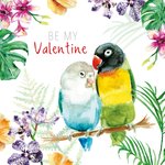 Verras jouw valentijn op Valentijnsdag. Op deze kaart zie je twee verliefde parkietjes en de tekst: Be my Valentine.