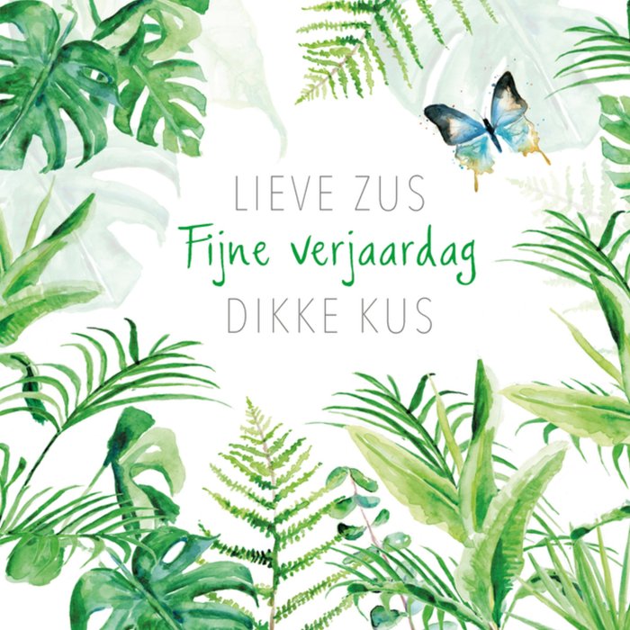 Een leuke en creatieve kaart van Michelle Dujardin met junglethema. Op deze kaart staat: Lieve zus fijne verjaardag dikke kus.