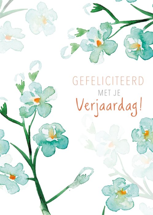 Prachtige verjaardagskaart met blauwe bloemen en de tekst: 'Gefeliciteerd met je verjaardag!' Verras iemand met deze aquarel verjaardagskaart van Michelle Dujardin.