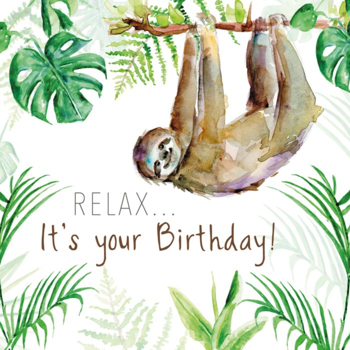 Feliciteer de jarige met deze vrolijke verjaardagskaart. Op de kaart is een grote illustratie van een luiaard te zien die in aan een tak hangt. Om de luiaard heen zijn illustraties van verschillende bladeren te zien. Op de kaart staat de tekst "RELAX... It's you Birthday!".