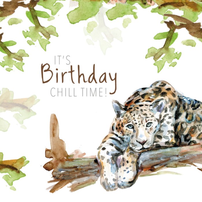 Feliciteer de jarige met deze leuke kaart. Op de kaart staat een illustratie van een tijger die lekker op een tak ligt. Op de kaart staat de tekst "It's birthday chill time!"