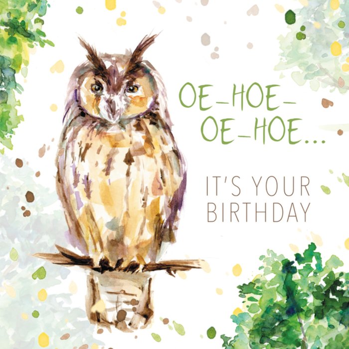 Oe - Hoe - Oe - Hoe... It's your birthday. Wie verras jij met deze leuke verjaardagskaart? Op de kaart zie je een aquarelillustratie van een uil.