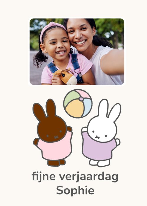 Verras met deze schattig Miffy verjaardagskaart. De naam en foto zijn aanpasbaar.
