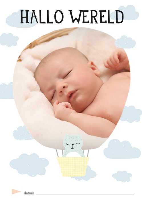 Een schattig geboortekaartje met wolkjes en een getekende luchtballon waaraan je een foto toevoegt. "Hallo wereld"