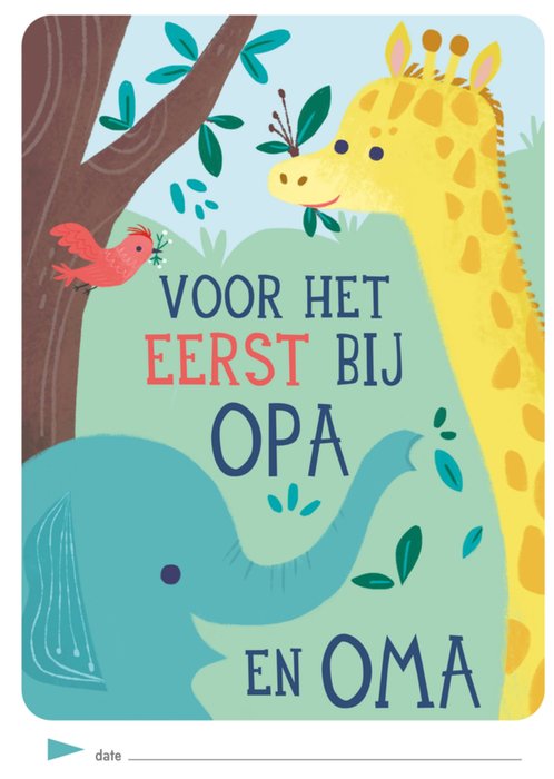 Voor het eerst bij opa en oma (logeren), is natuurlijk één van de vele mijlpalen in het jonge leven van kinderen. Een schattige kaart met een illustratie van jungle dieren en daarbij de tekst: "Voor het eerst bij opa en oma"
