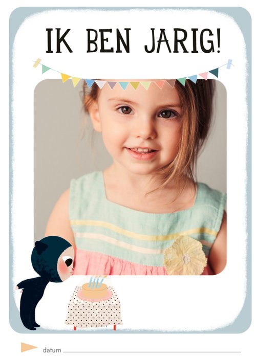 Schattige verjaardagskaart met foto en de tekst: "Ik ben jarig!"
