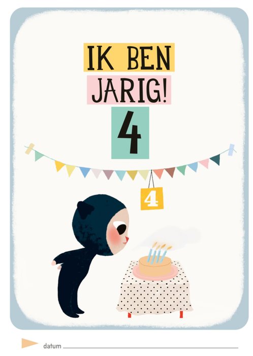 Feliciteer de 4-jarige met deze grappige verjaardagskaart met illustraties en de tekst: "Ik ben jarig"